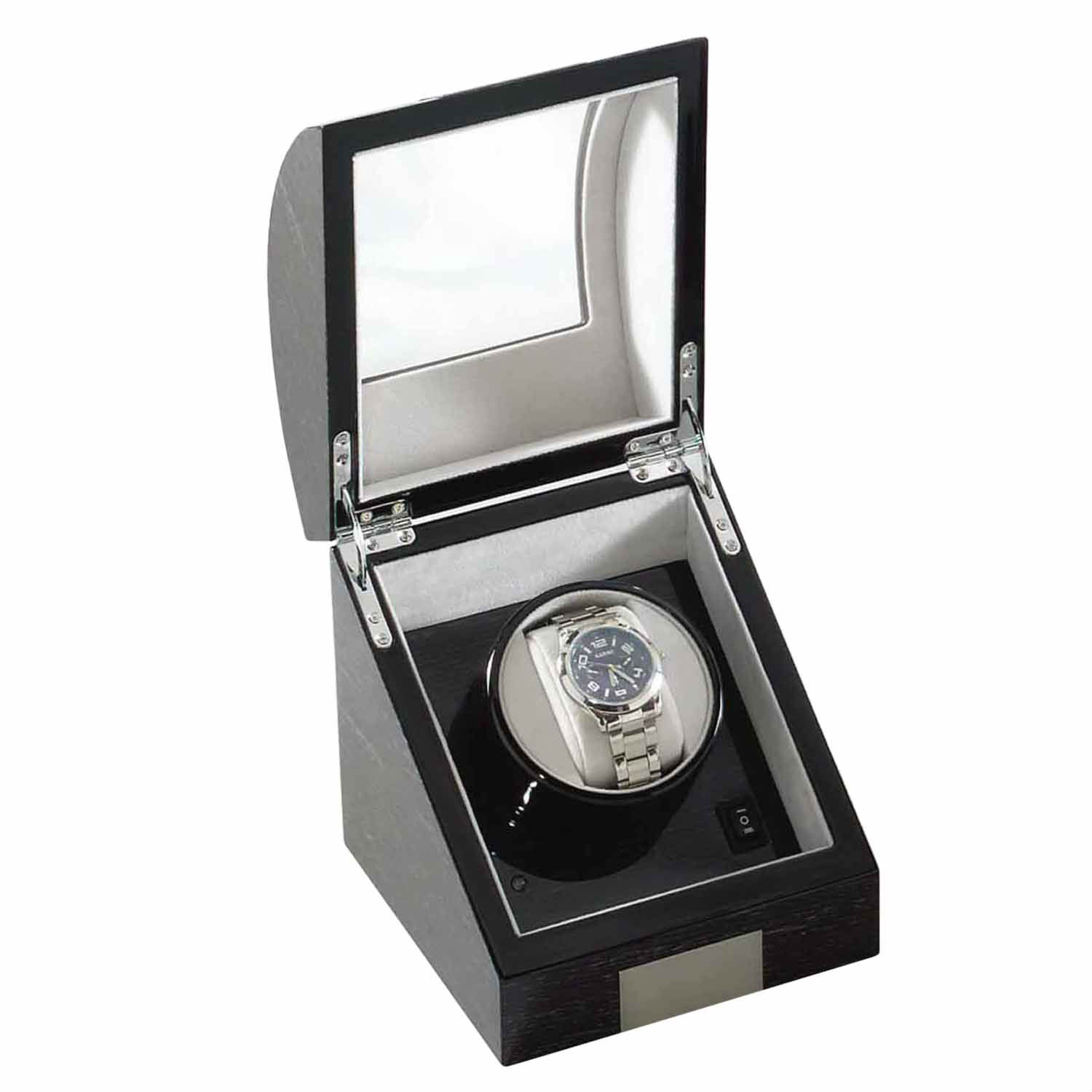 Wooden watch winder laminated with veneer and decorated with stainless steel. Various sizes and colours are available.