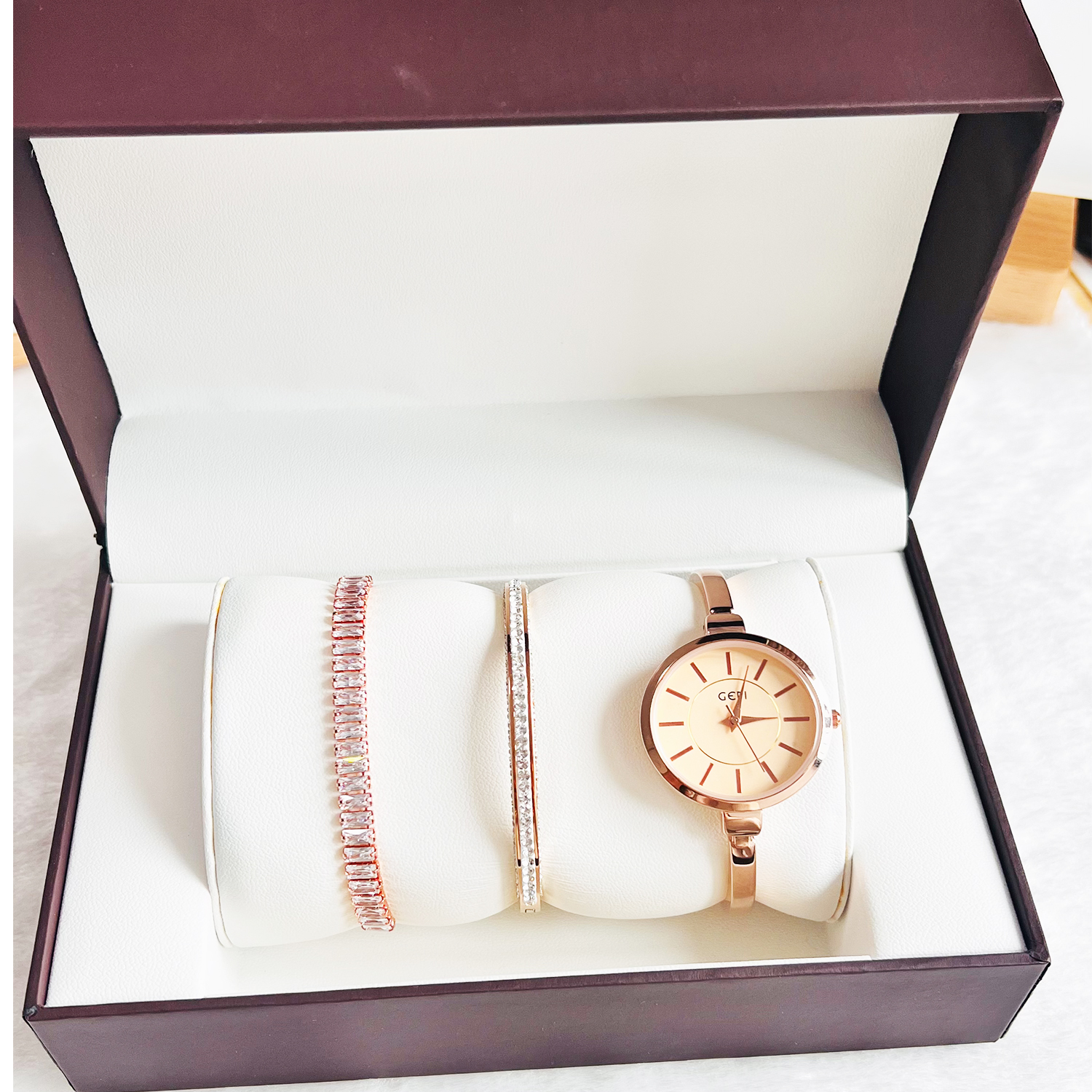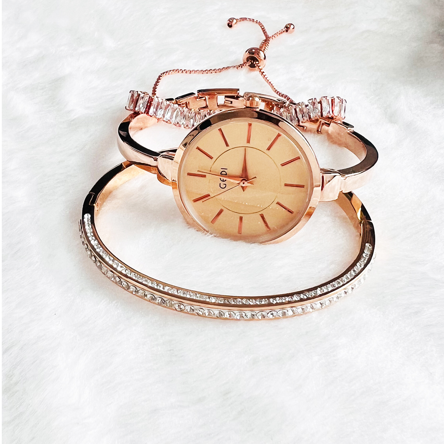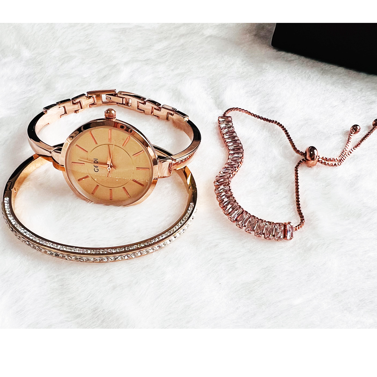 • Highlighted here is a set of Ladies fashion Watch with an alloy Case & Band and Stainless Steel Jewelry with good long lasting plating. Different models and colors of bracelet & bangle jewelry are available. Feel free to change the combination of the Gift set from our collection in your respective orders.