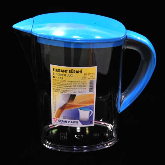 This is a water jar with a refined design. The water jar is designed with a transparent casing for easy viewing of the content. The jar features a curved handle and is easy to hold.