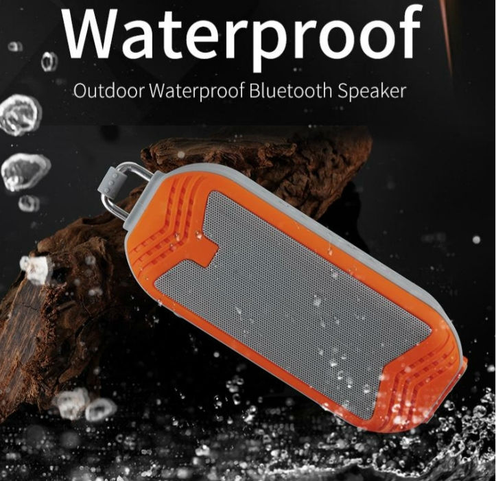 Highlighted here is a waterproof Bluetooth speaker for outdoor activities use. It comes in a rounded rectangular design and has a clasp on top for attachment. This Bluetooth speaker delivers remarkable audio quality and offers simple buttoned controls.