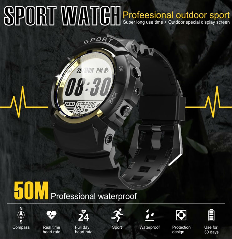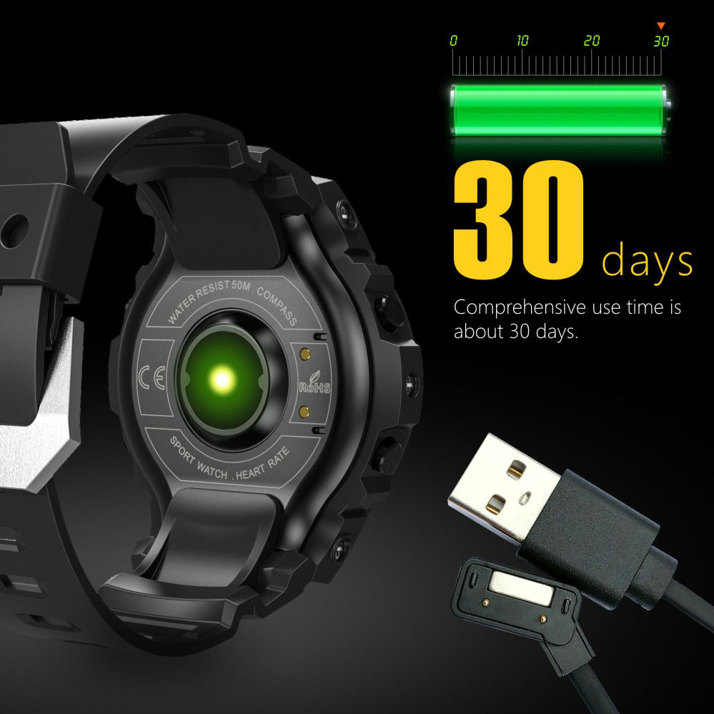 4 kinds of dial, 6 sport modes, compass, heart rate, ultra low power consumption and 50 meters waterproof.