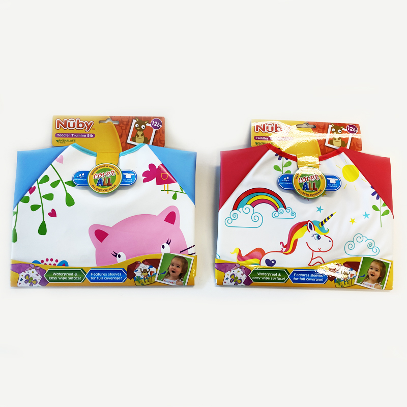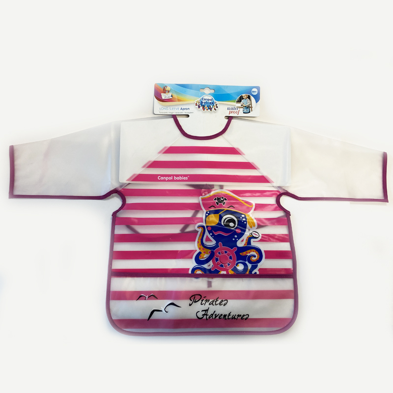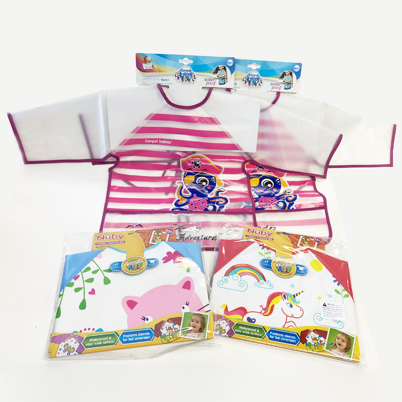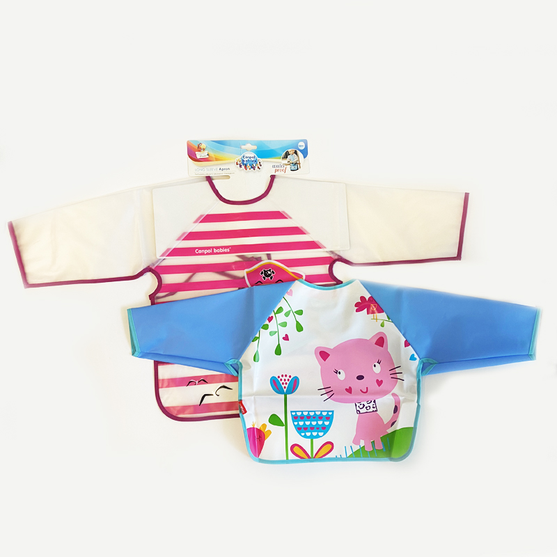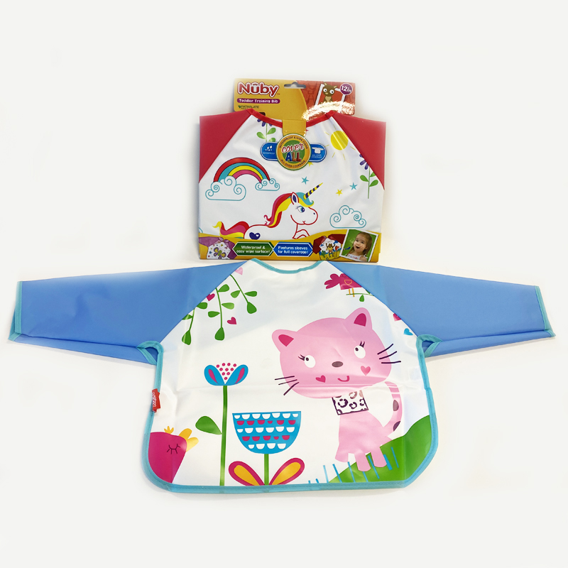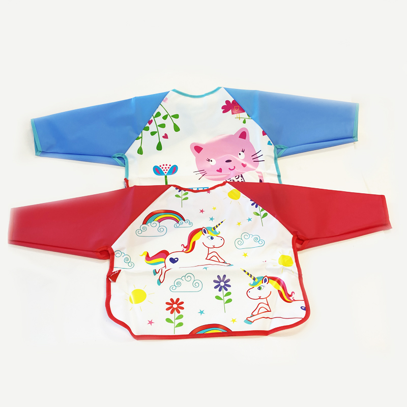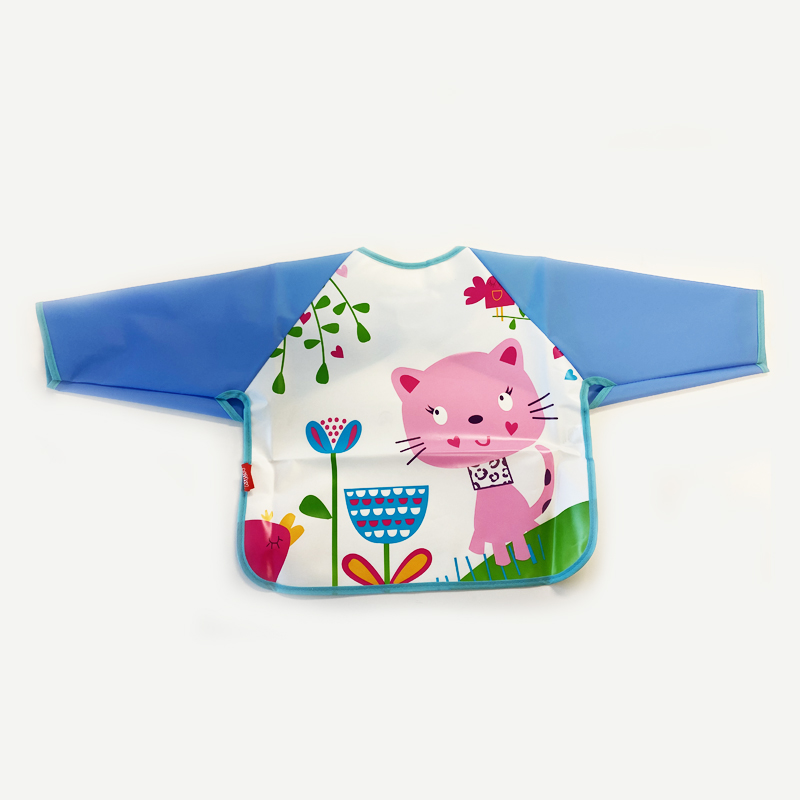 Plastic baby bibPlastic baby smockWaterproof baby bibMaterial: 100% PEVASize: 34(76cm with sleeve)*35cm12+month We offer 100% cotton baby bib/ peva baby bib/ polyester+tpu baby bib