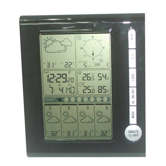 This weather station information adopts update information from the Internet. It shows the weather condition in five days. It shows the temperature and humidity of both indoor and outdoor.