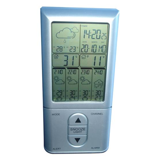 This weather station information adopts update information from the Internet. It shows the weather condition in five days. It features blue LED backlight.