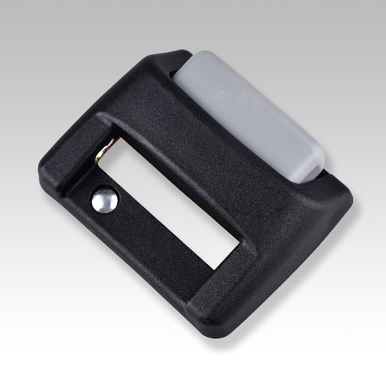 This is a webbing slot adjuster with a black finish. It is sturdily constructed for a long service life. It is a perfect device for adjusting the seat belt.