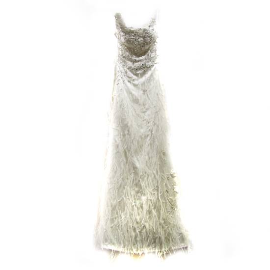 This is a white coloured wedding dress which is of sleeveless and decorated with sparkling beads feathers and ruffles.
