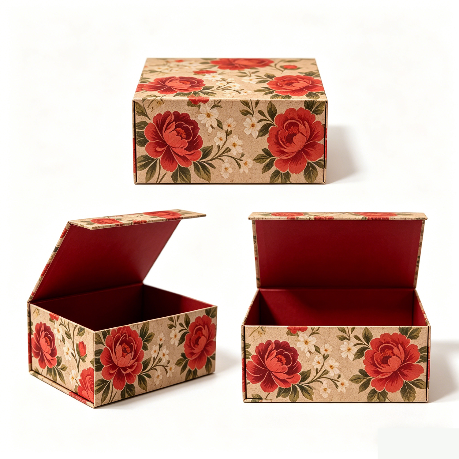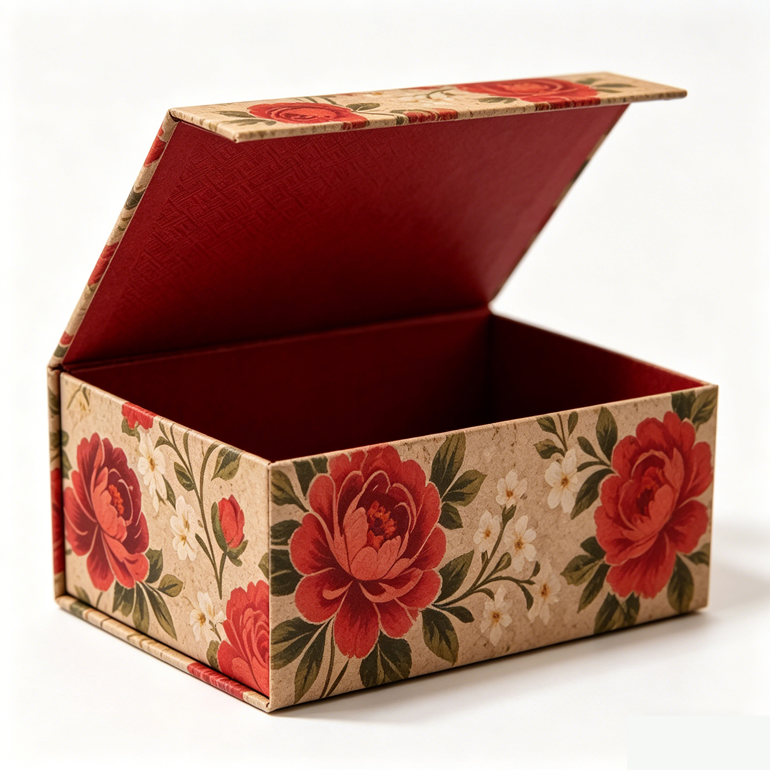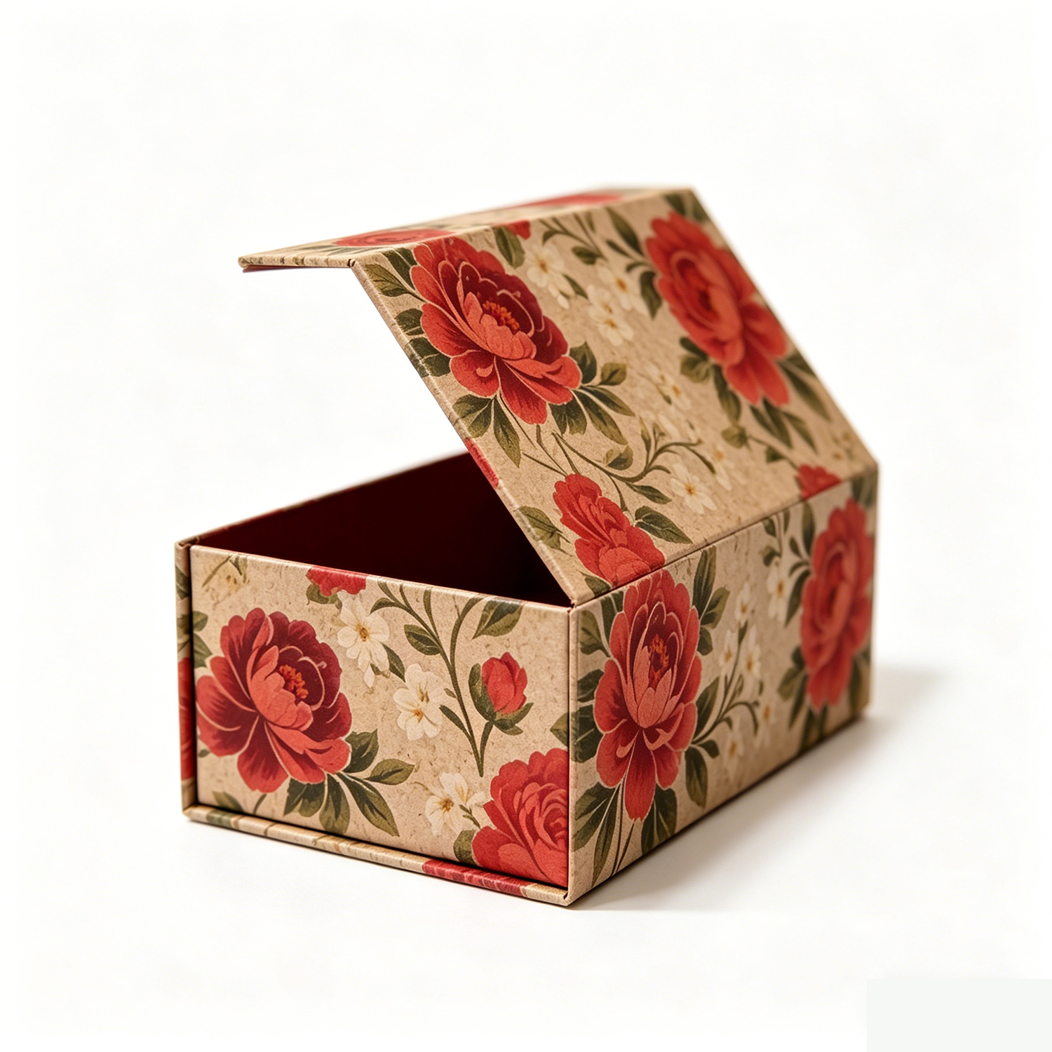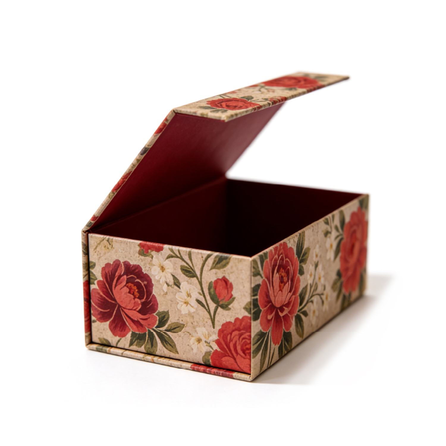 The floral design is printed on premium cardboard, and the sturdy magnetic closure secures the lid, ensuring that the contents are kept safe and sound. The interior is lined with a soft, deep burgundy material, which not only enhances the box's luxurious feel but also provides extra protection for delicate items.