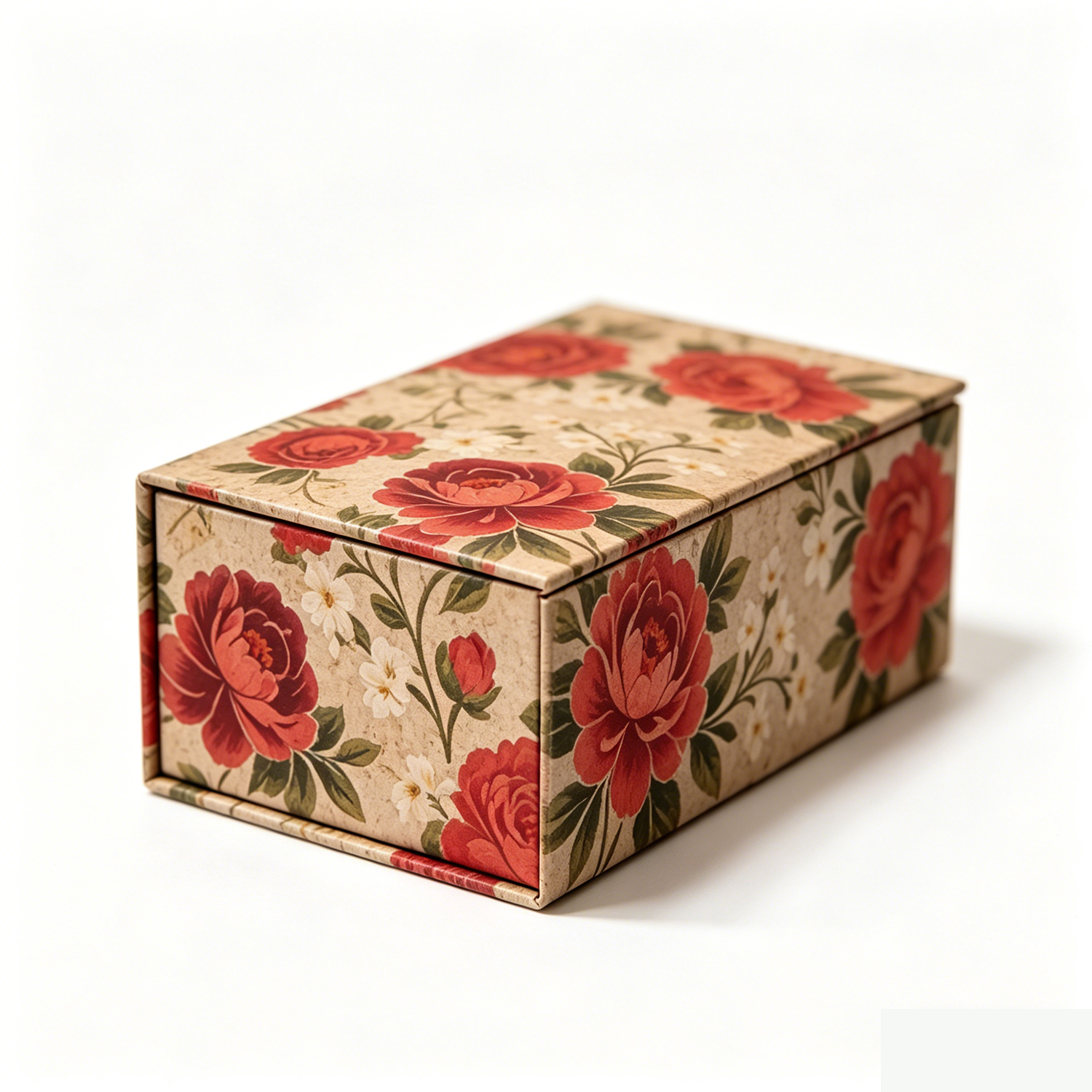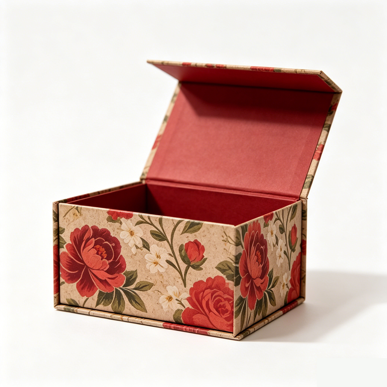 The Magnetic Wedding Box features a sophisticated and vintage-inspired design, with a soft beige background adorned with intricate floral patterns, including rich red roses and soft white florals.