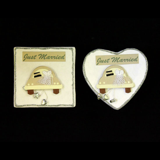 This wedding gift set in the photo boasts a cute look of a cartoon honey moon car. It is attached with three metal charms to add fanciness. This wedding gift set is a heart-warming item to impress newly married couples.