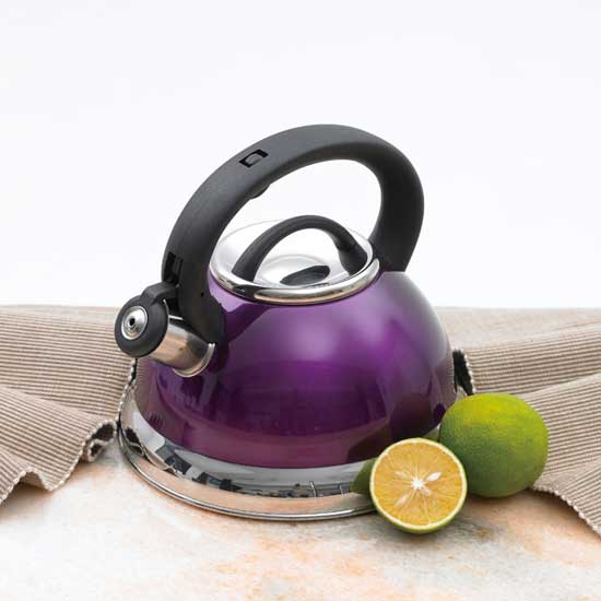 Displayed here is a whistling tea kettle with a stainless steel body. It comes with an insulated handle for a cool hand touch. This whistling tea kettle is built to last for years.