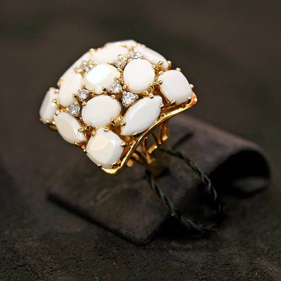 This is a white agate and diamond ring set in 18k yellow gold. The ring features multiple oval, cushion and marquise white agates and small white diamonds in prong setting on a square gold piece. The spilt shank of the ring is decorated with simple openwork.