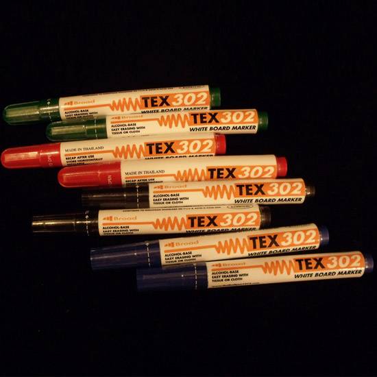 The alcohol-based white board markers come in 4 colors including green, red, blue and black. They can be erased with tissue or a cloth. These white board markers are great writing instruments for white boards.
