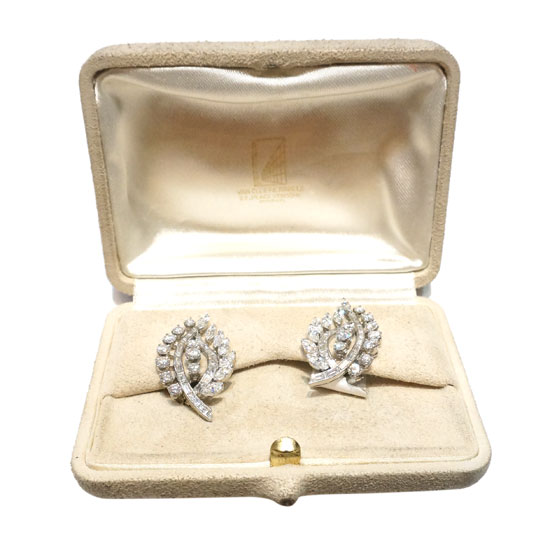 These are diamond earrings coming in a white gold setting. The diamonds are arranged in a leaf shape for an elegant touch.