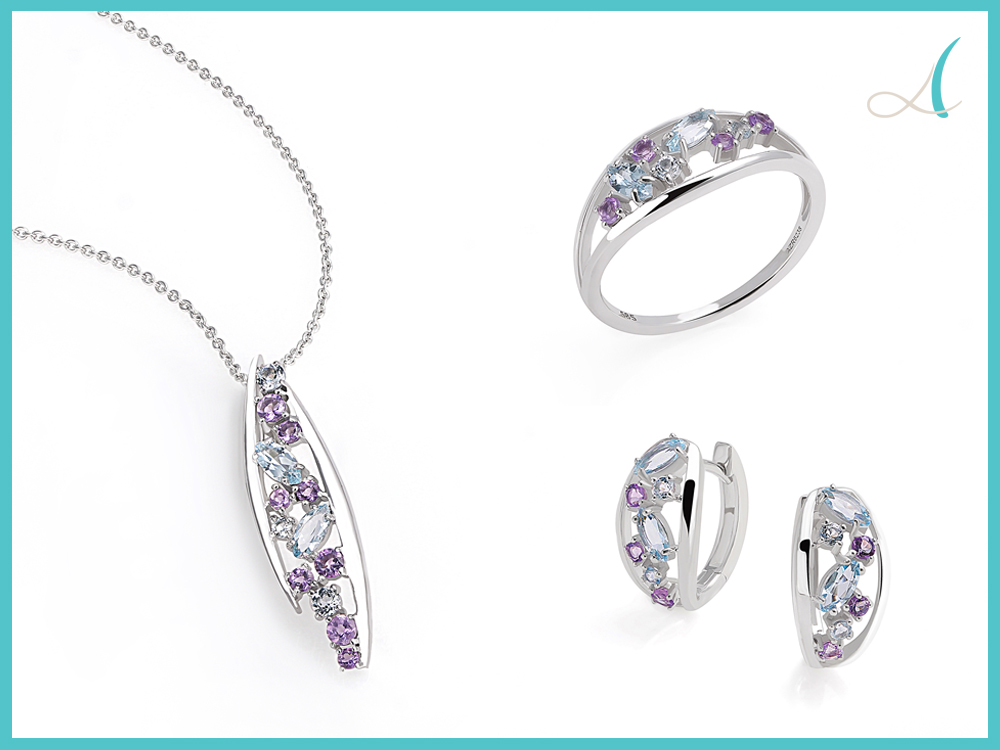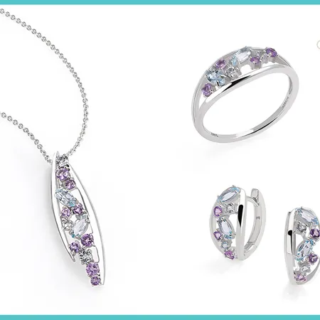 14K Gold Jewelry Set with Rhodium Plating set with Amethyst, Blue Topaz & White Topaz