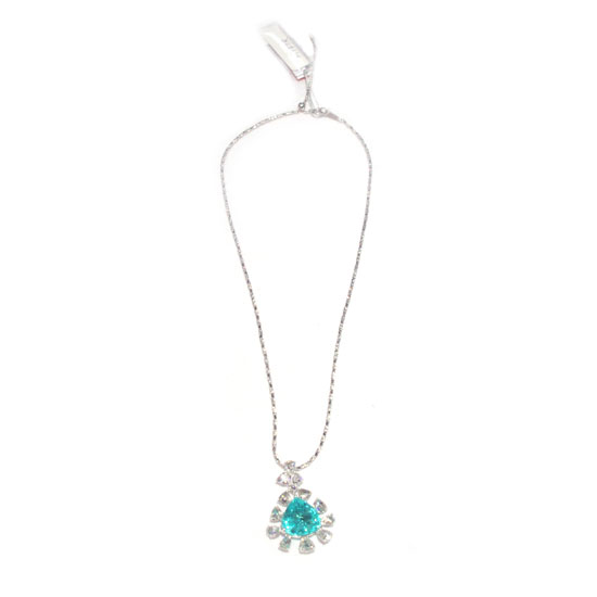 This necklace with a pear-cut tourmaline center stone shines with a turquoise shimmer. The glittering gem is set in 10.51K white gold for a luxurious flair. This gorgeous necklace can finely complement your elegant look.