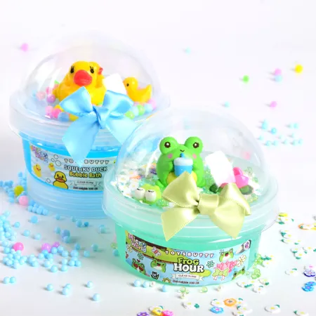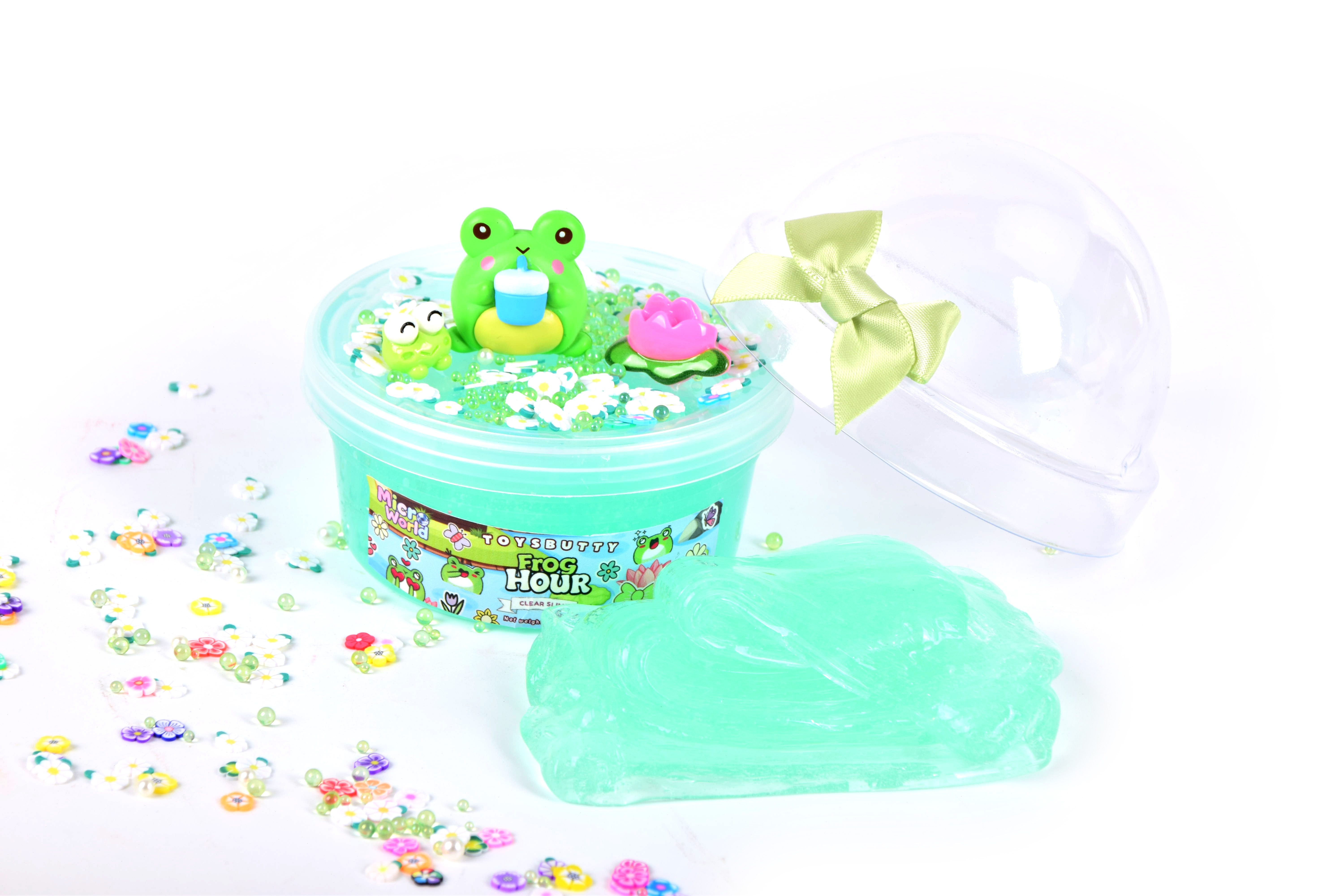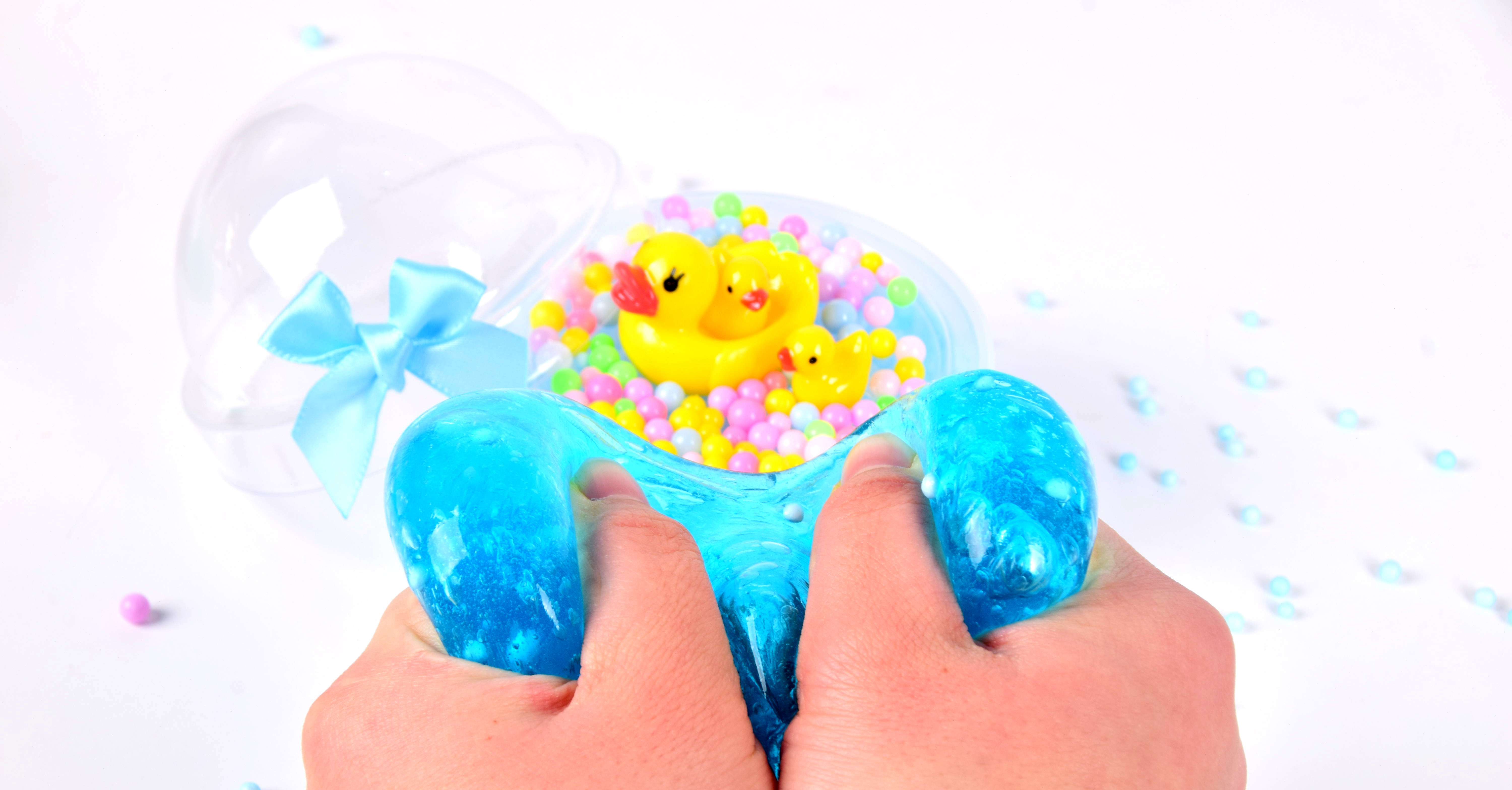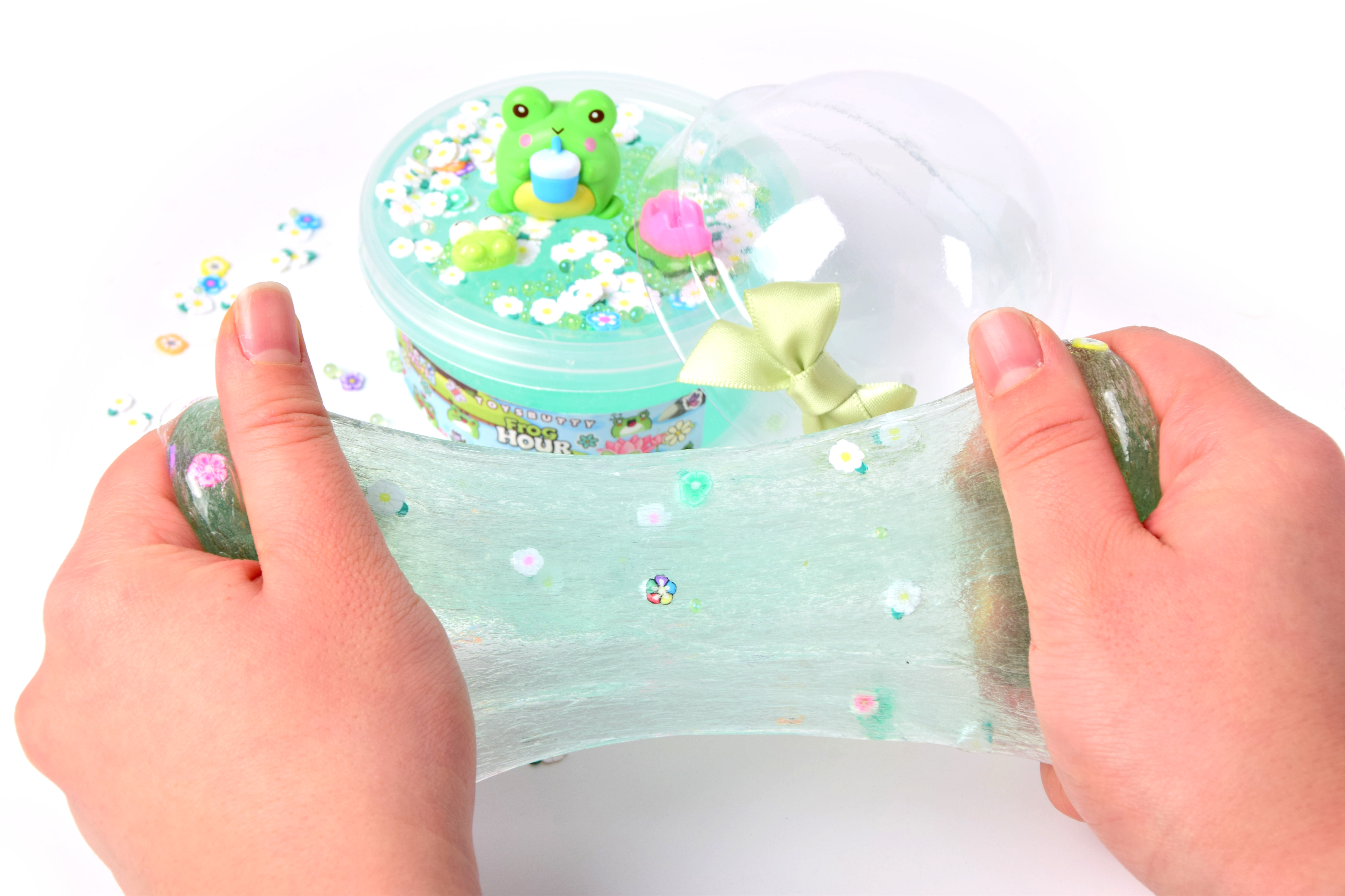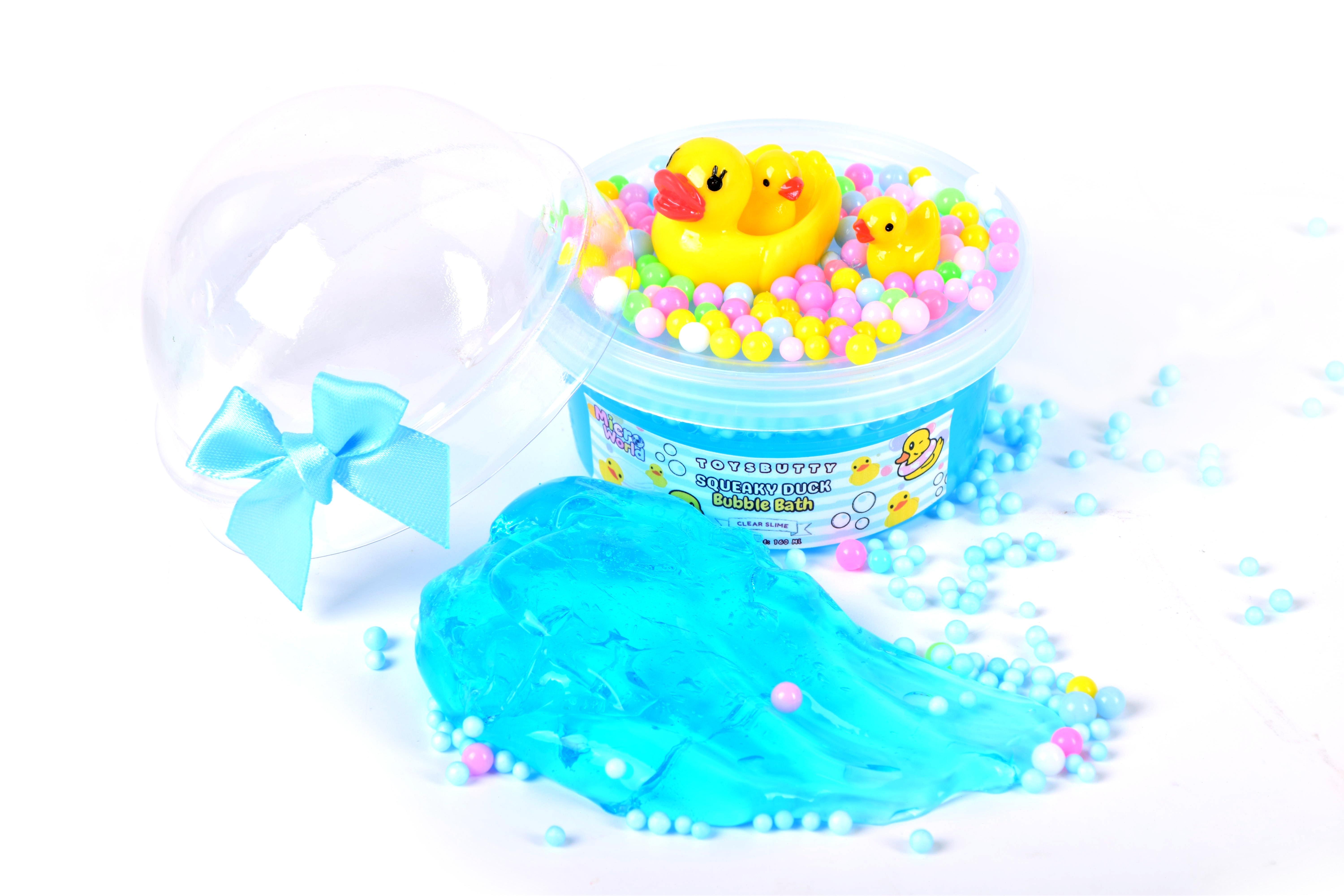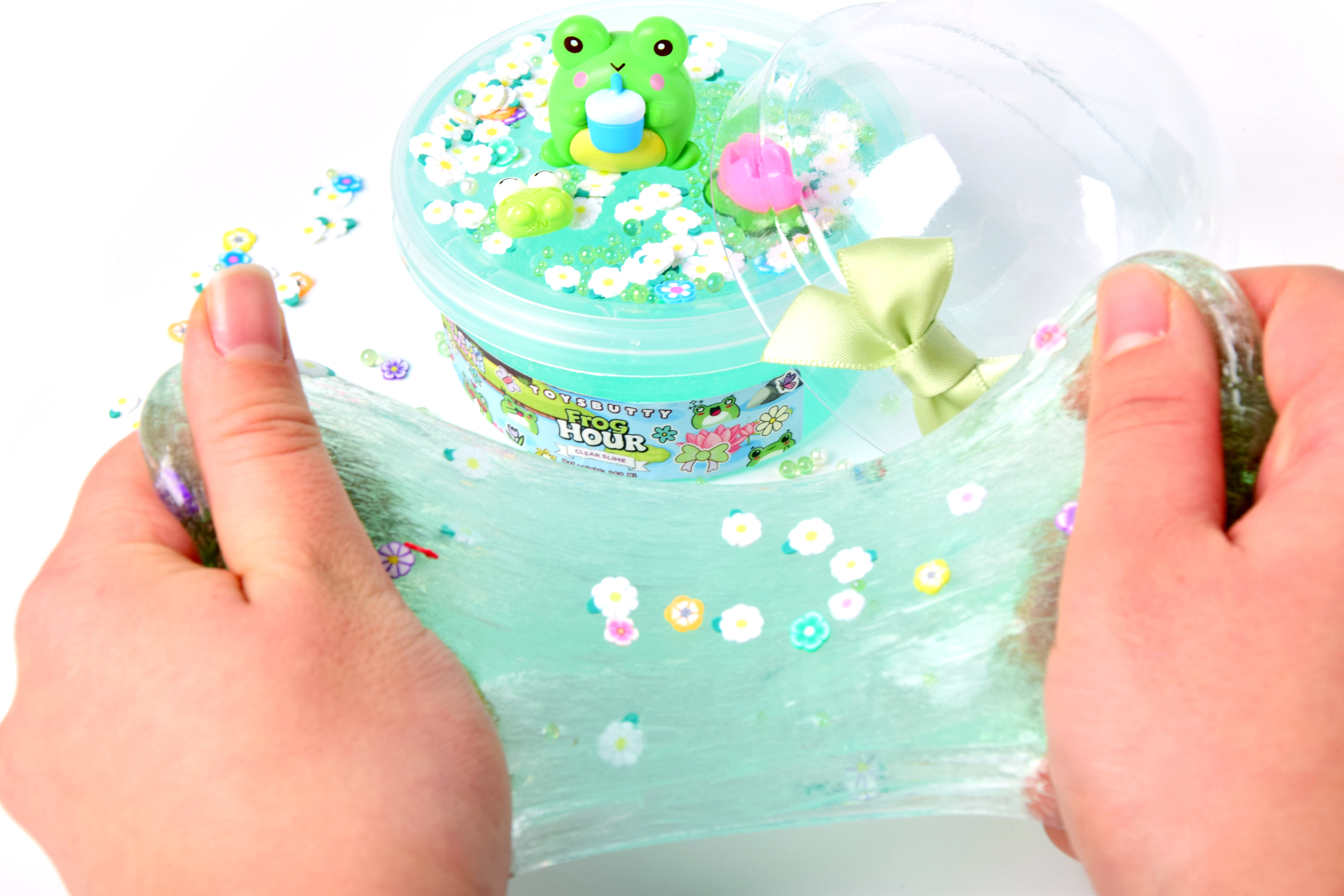 Texture: Smooth, stretchy, and non-sticky blue transparent slime filled with foam beads, dolphin glitters, and star confetti.