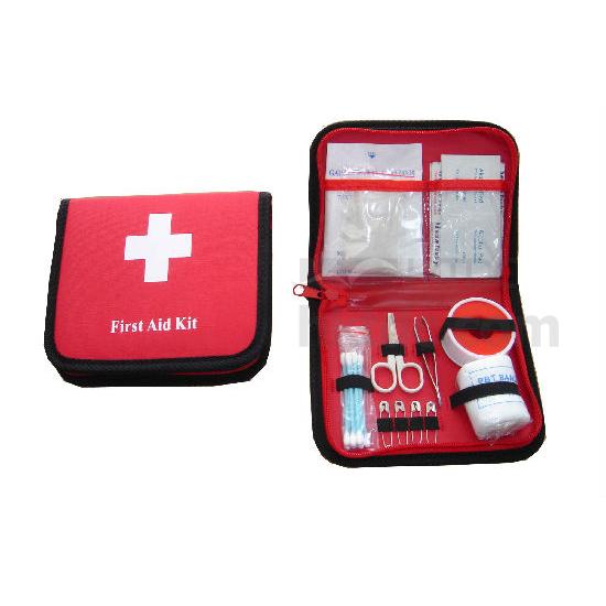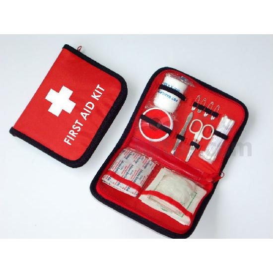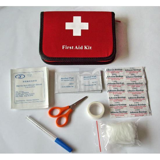 - Content: adhesive bandage, sterile wound pad, vinyl glove, cotton tipped applicator, cotton bandage, adhesive tape, safety pin, tweezer, scissors.