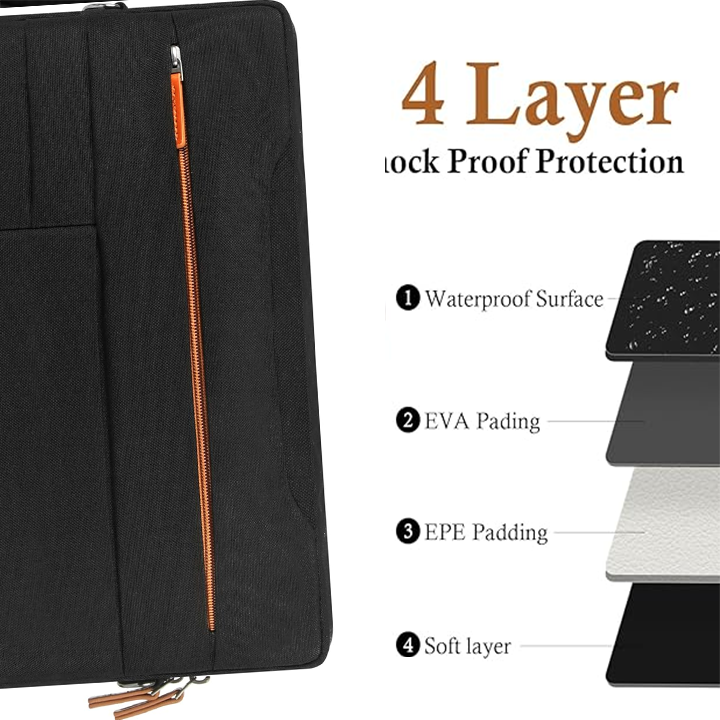 Multi-Layer Protection System: The men computer bag compartment features a sophisticated 4-layer lock proof protection mechanism. The outermost layer is a waterproof surface, safeguarding your laptop from unexpected spills and light rain. Beneath this, there's EVA padding, which provides excellent shock absorption, protecting your device from accidental bumps and drops. Further inside, the EPE padding adds an extra cushioning layer, ensuring your laptop remains secure and intact. This comprehensive protection system gives you peace of mind, knowing that your valuable laptop is well-protected at all times.