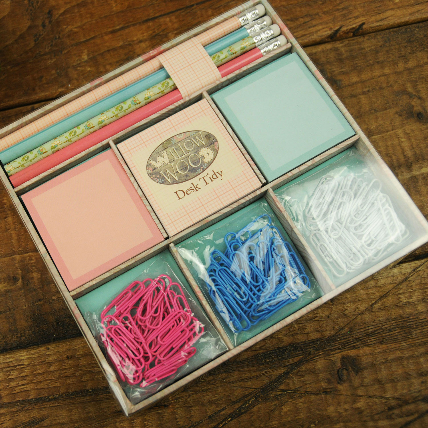 A great addition to any desktop, this desk tidy contains 3 sticky memo pads, 4 lead pencils and 120 co-ordinating paper clips.