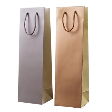 Bring the wine lover the perfect present by wrapping a bottle of wine in this paper wine bag. The front is available in silver toned or copper toned while the side is in champagne gold. The strings share the same color with the front, pulling off a simple yet elegant look. Wrap any standard sized bottle of wine or any other beverage bottle with this sturdy and stylish wine bag.