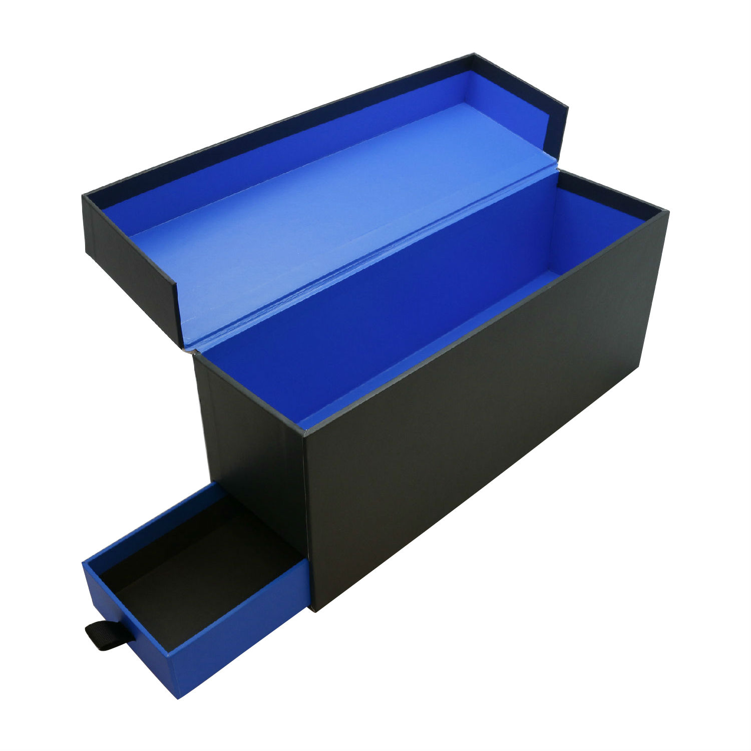 The pictured wine box featured a sturdy cardboard construction and comes in a rectangular shape. It has a large main compartment for storing a bottle of wine and comes with a drawer at the bottom for storing chocolate. This wine box has a flip top cover and is equipped with a grosgrain handle for carrying.
