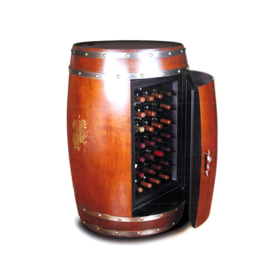 Displayed is a barrel-shaped wine cooler that can accommodate 28 bottles of wine. It highlights a curving handle, silver-hued bands on the top and bottom and grape patterns for a vintage touch. This well-made wine cooler is an ideal choice to keep your wine in a desirable temperature.