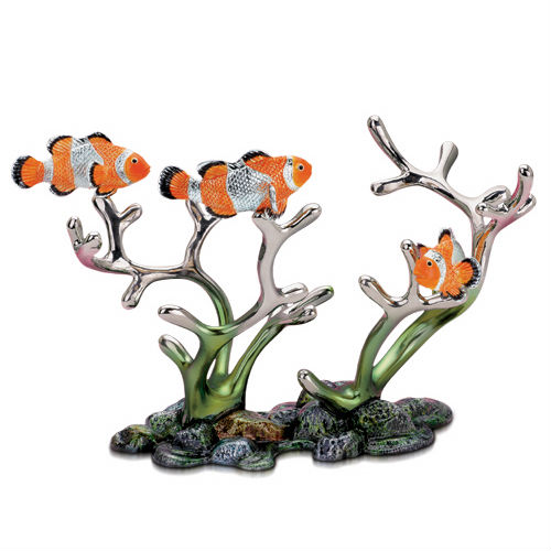 Three clown anemone fishes with coral reef.
