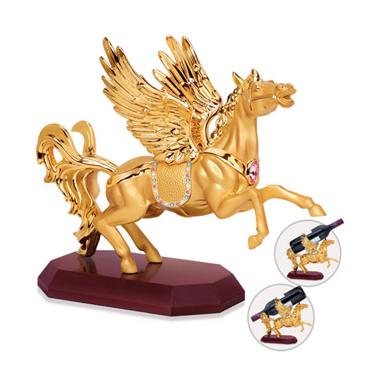 This is a golden-toned wine holder that is finely crafted with exquisite details. It boasts a novel soaring flying horse on a flat base. This meticulously-designed wine bottle is ideal for brightening up any home decoration.