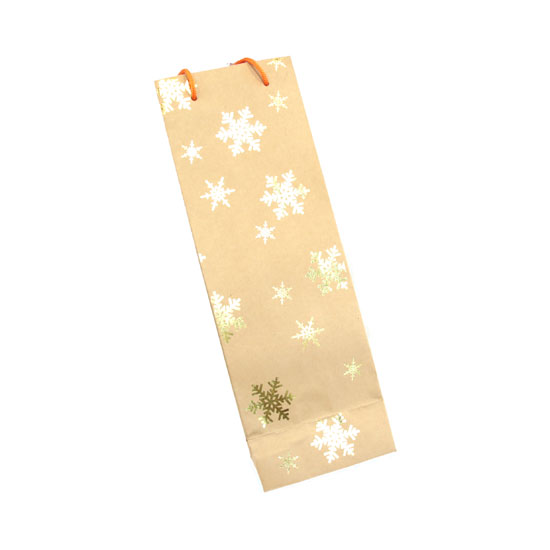 This paper bag with a tall design is specially designed for wine bottles. The gold foil printed snowflakes flaunt an air of luxuriousness. This amazing bag is great for both personal and commercial uses.