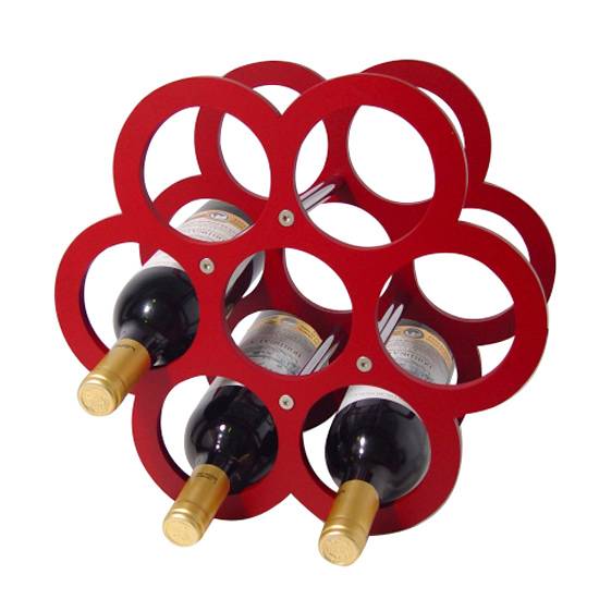 This wine rack displays a flower-shaped pattern. It shows a flower with six petals, each carrying one wine. Added with the middle hole, this wine rack can carry a total of seven wines. Because of its shape, it can be stably put on a table, thus the wines will not easily fall off.