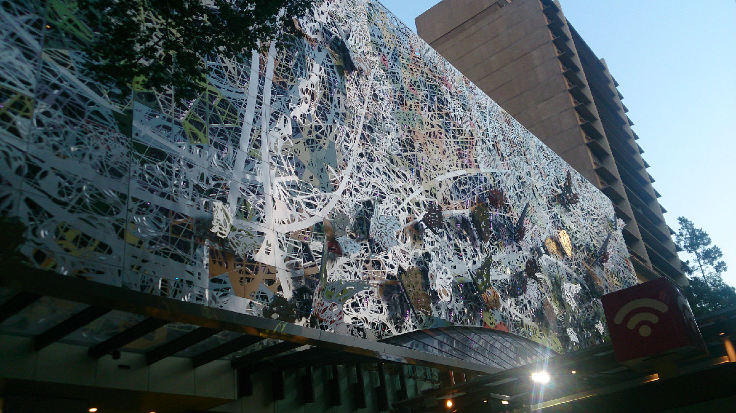 Fabrication challenges: The design is presented in a double layer cut metal screen suspended in front of the building’s facades. Unique fabrication systems were developed to cut, fold and light the art facade.