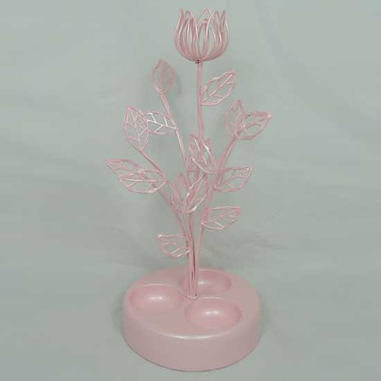 The wire stand designed for hanging jewelry showcases an engaging floral design. You can suspend your earrings and necklaces on it. It is finished with a round-shaped base with three pits for your rings and brooches.