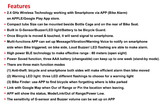 2.4GHz wireless technology working with smartphone via APP(Bike Alarm)