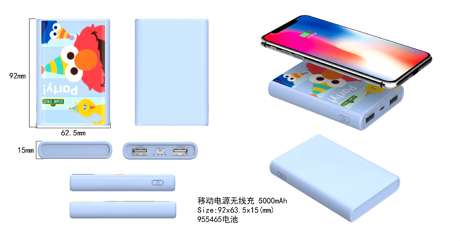 Material: ABS Product size:92*63.5*15mm Weight:122g Battery type:955465 Li-polymer 5000mAh Micro input:5V/2A USB A output1/2: 5V/2A Wireless output:5W