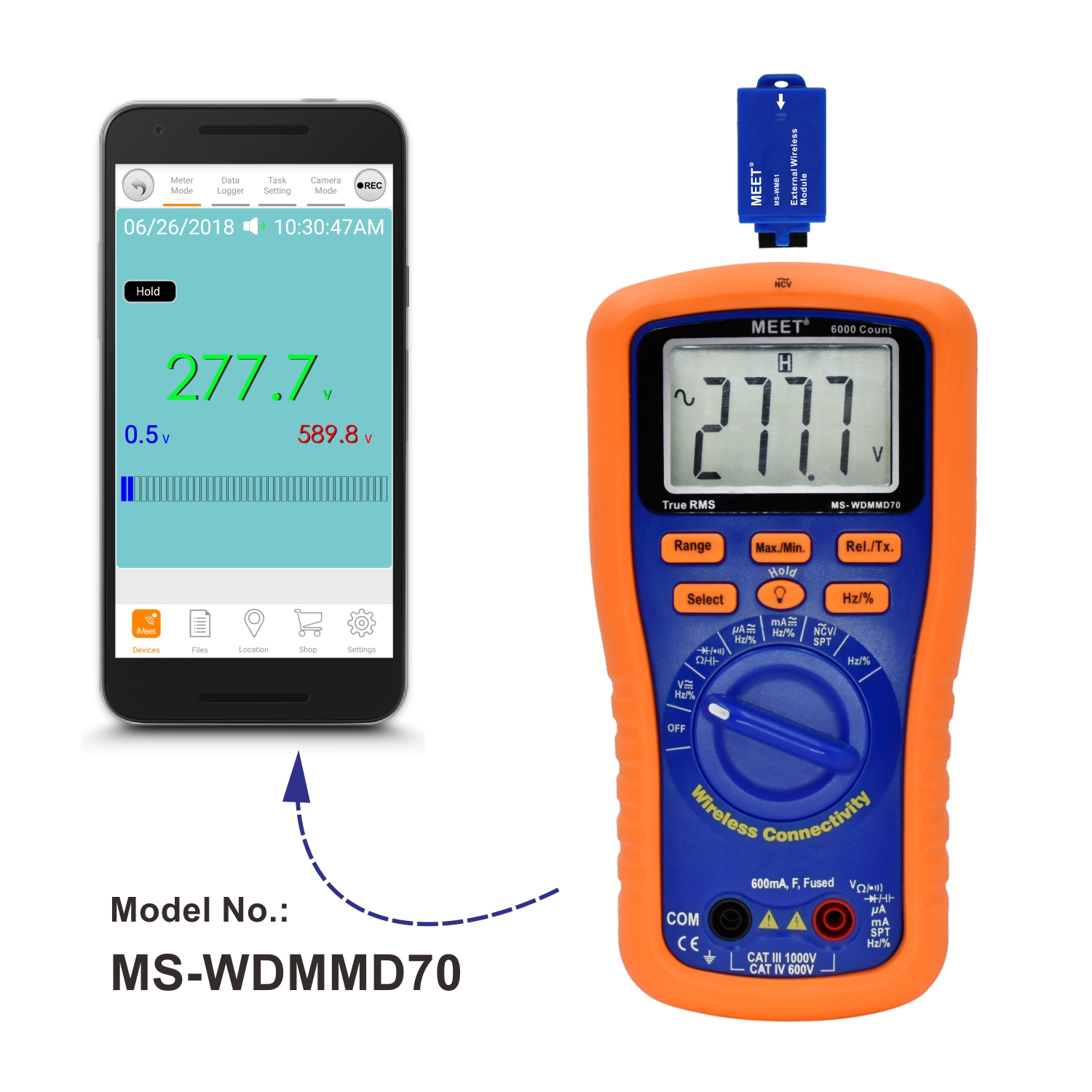 This is a external wireless connectivity Digital Multimeter Detector integrated with 6000 Count, True RMS, auto and manual measurement.
