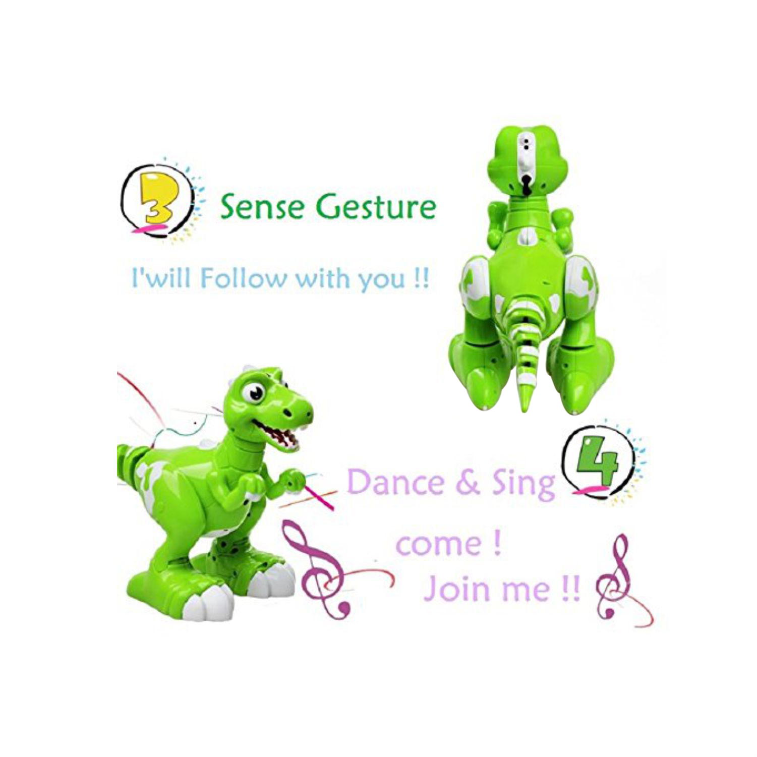Built in gesture sensor on the dinosaur’s head, the dinosaur can sense you gesture when enter into sensing mode, you can use your hand to show the dinosaur to move forward with his eyes turn green.