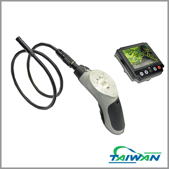 The endoscope is a visual aid for troubleshooting or inspection of voltage-free systems and installations. The camera picture is displayed on a detachable TFT monitor. The lighting can be controlled at the camera point. A PAL/NTSC video output is available. Photos and videos can be stored on an optional microSD card and can be transferred to PC. The goose neck camera is water tight and can be used in watery liquids (no acids or alkaline solutions). The main unit may not be exposed to or submerged in moisture. Power supply is via four AA batteries (not included). Operation in potentially explosive areas and/or use on persons or animals is not permitted.