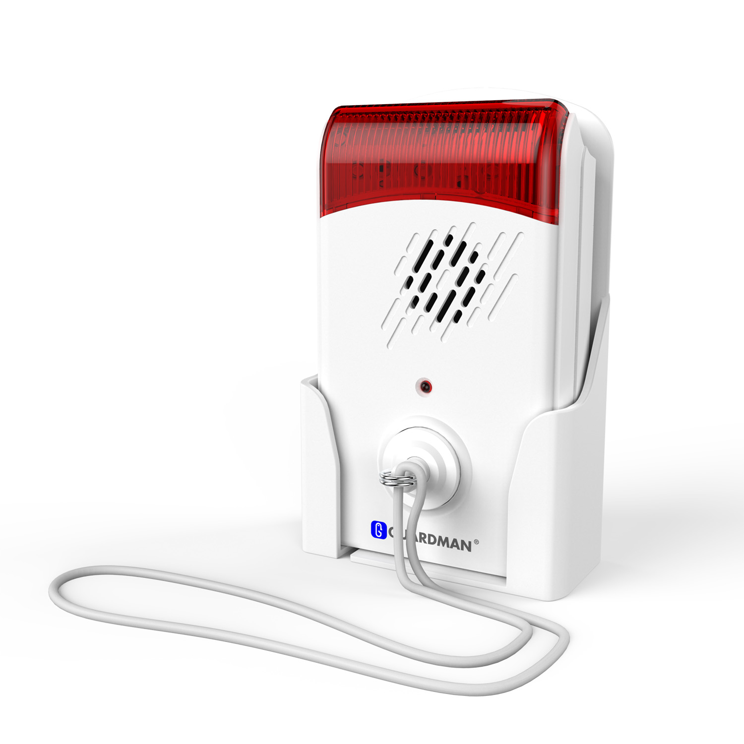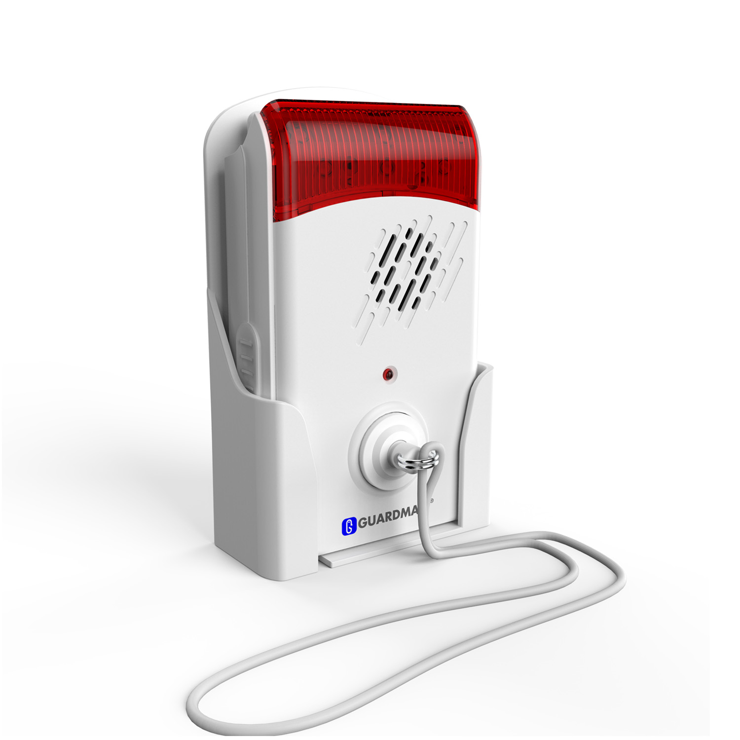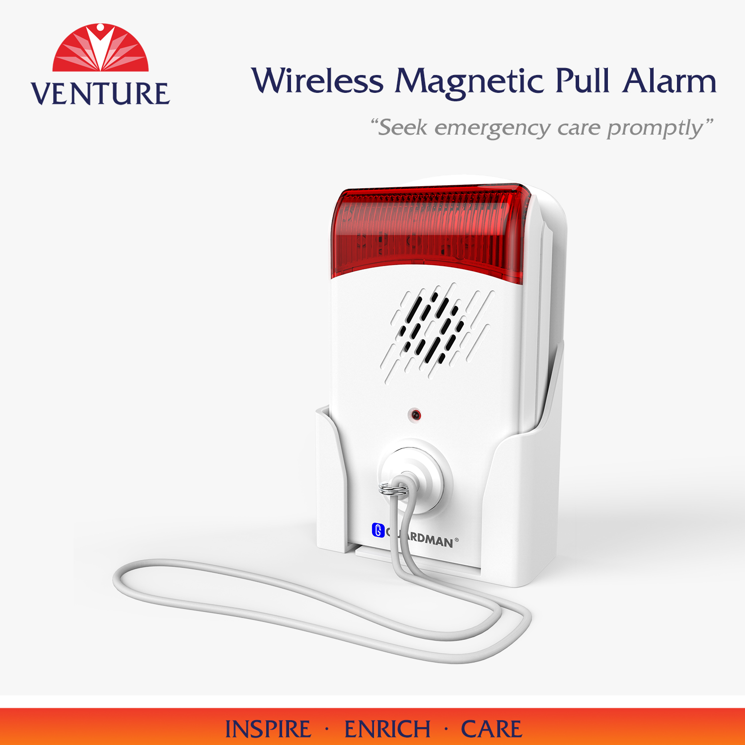 This pull string and magnet alarm is designed to ensure safety of the elderly or patients. Unplugging the magnetic cord activates the alarm to emit loud alert sound with bright LED light, while alert can be turned off by replacing the magnetic contact switch. The alarm is designed to operate with long wireless transmission rage with low power consumption.