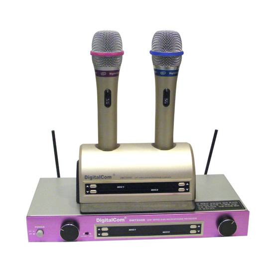 Featured here is a pair of wireless microphones with a console and a signal transmitter. The handheld microphones are placed on a charger. It is suitable for household uses.