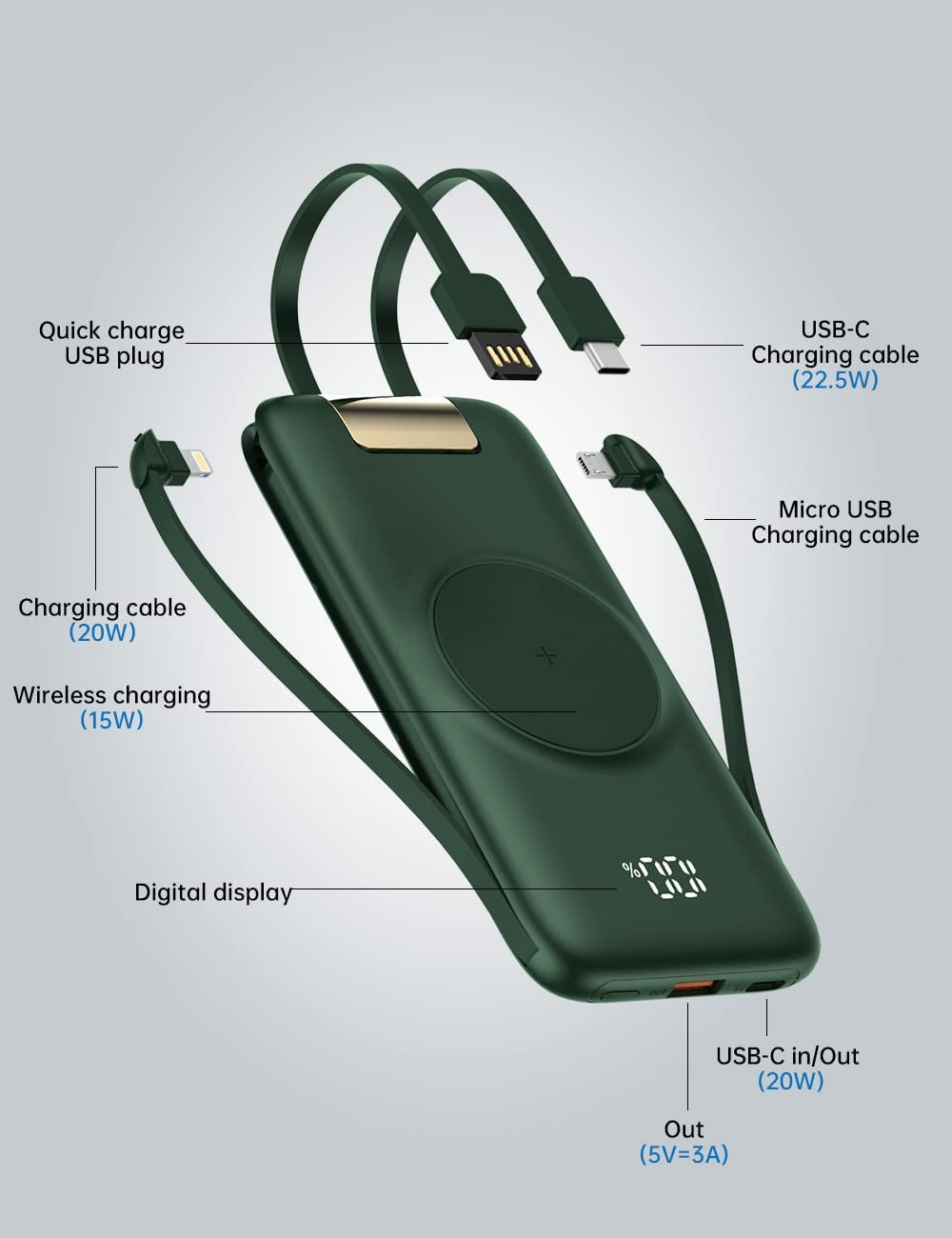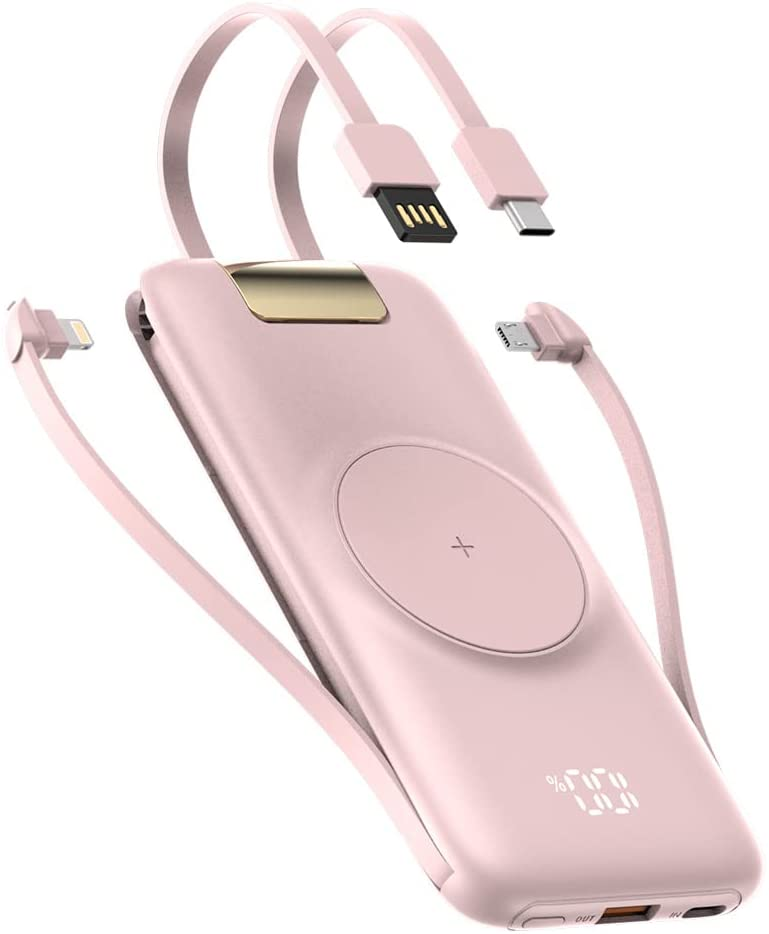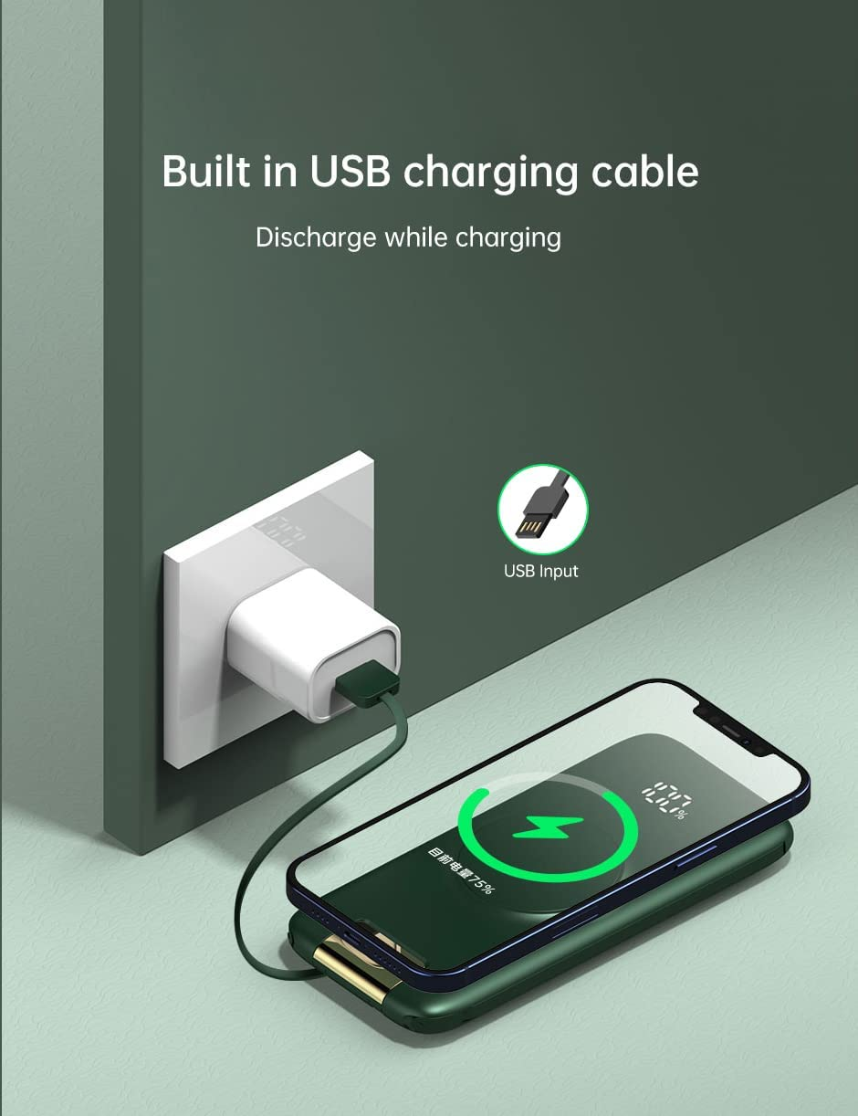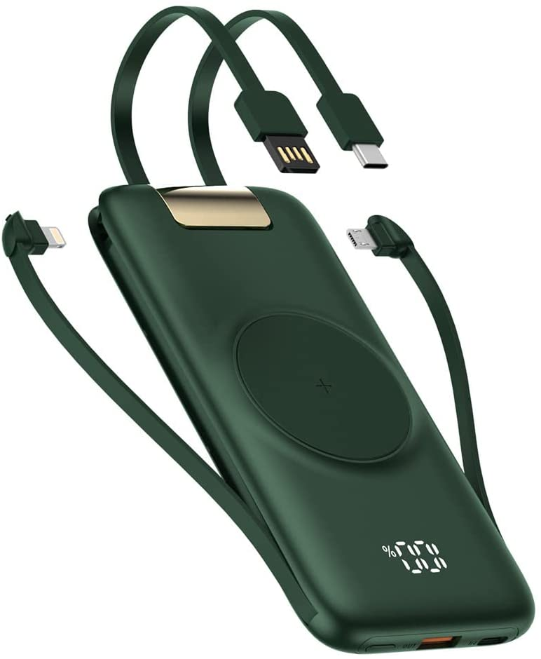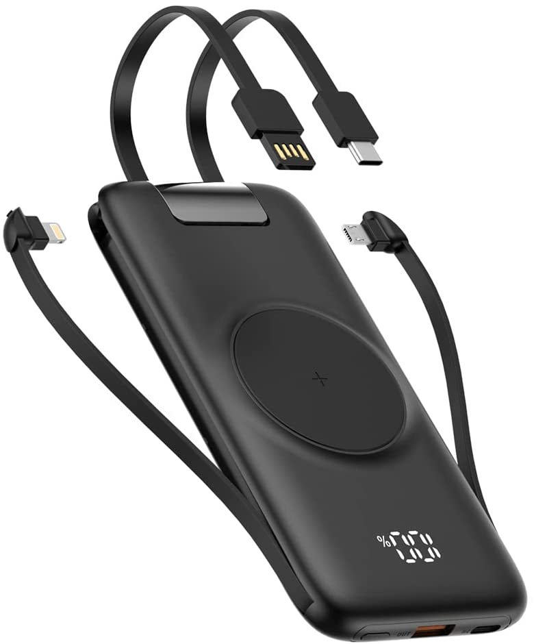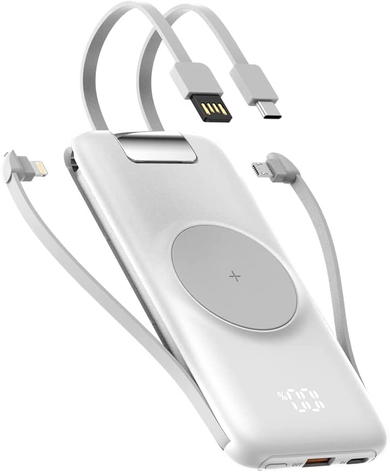 Wireless Portable Charger Fast Charging, Power Bank with Built in Cable, 10000mAh Ultra Slim Mobile Power Bank, Six Output & Dual Input External Battery Pack Compatible with iPhone, Android etc