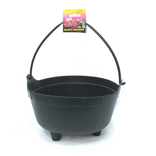 Presented here is a classic witch's cauldron in allover black. As a stylish alternative to classic pumpkin pails, this cauldron is also great for keeping or serving candies and treats. The cauldron will be a superb home decoration item or party favors during Halloween.