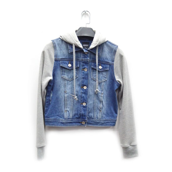 This is a women’s jacket with a fashionable and casual design. It features a blue denim body with gray fabric sleeves. This jacket is also designed with a gray hood for enhanced uniqueness.