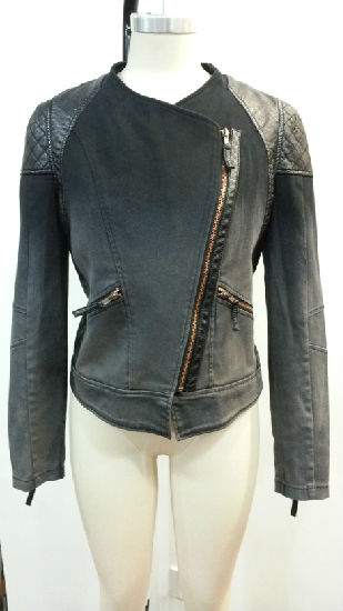 This PU jacket is made by 2 kinds of shell fabric, there is a contrast effect of quality & color. The 99%cotton 1% elastane shell fabirc with a gradient color.The PU fabric with top stitching.All the workmanship is not easy,this is a fashion style.