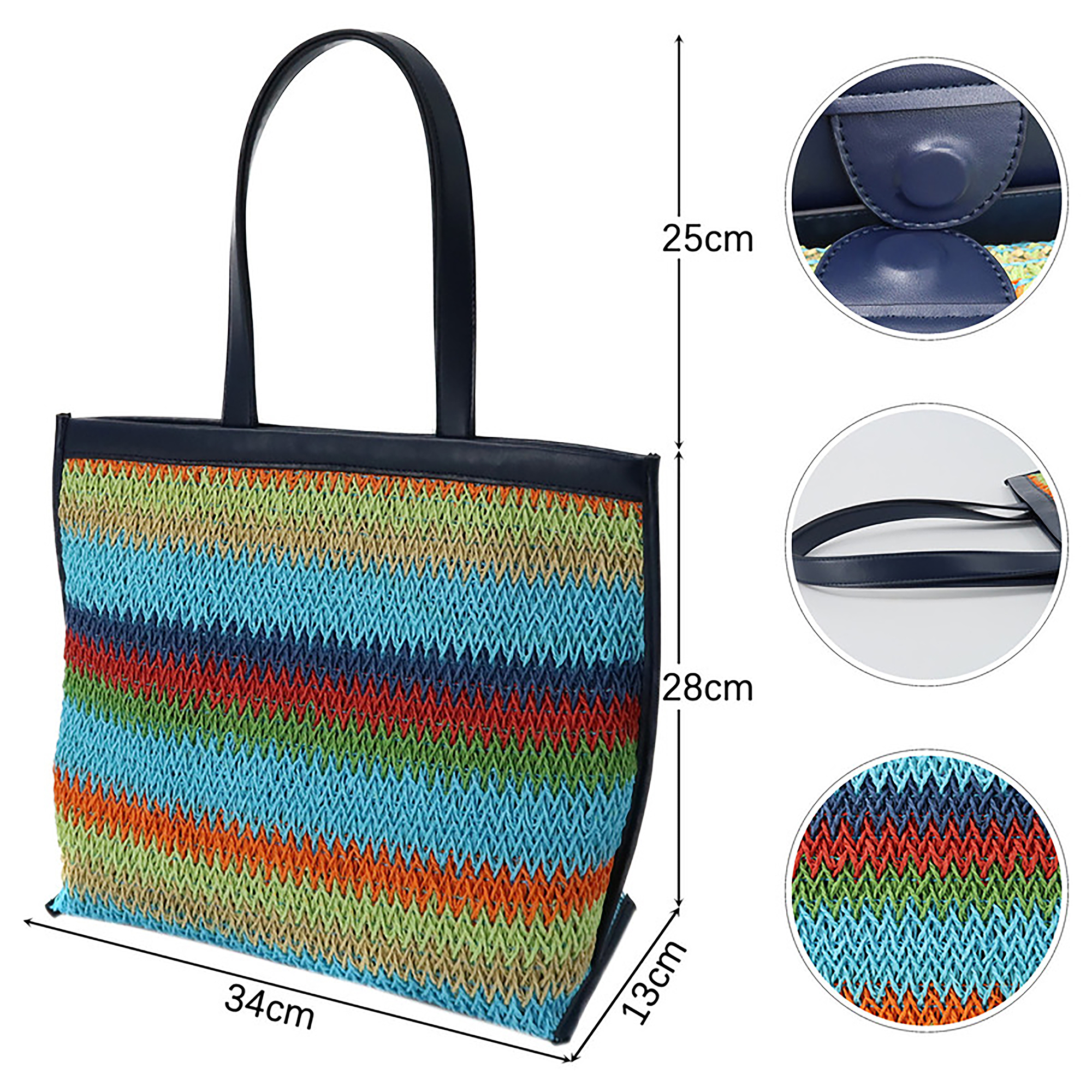 1. Material: Textile2. Handle: 25cm3. Size: 34cm x 13cm x 28cm4. Weight: about 0.47kg