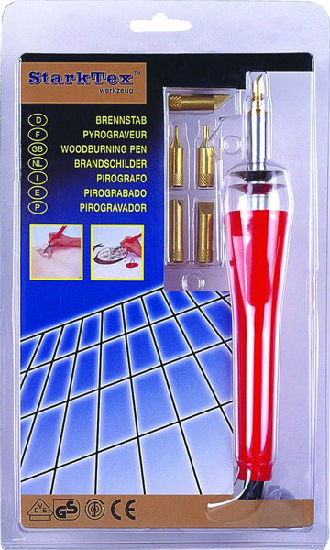 This traditional style 30W wood burning pen has a tip temperature of around 500 °C. It has one permanently attached all-purpose wood burning pen tip and comes with 5 tips in other shapes that can be screwed on top. The wood burning pen includes a small metal sheet stand and offers quick and stable heating performance.