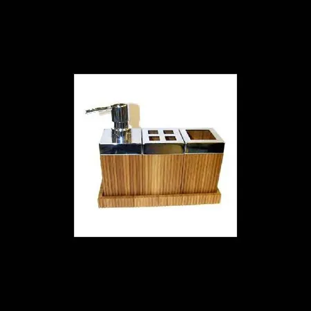 This is a set of bathroom accessories made of bamboo and zine alloy