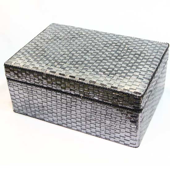 This wooden box is decorated with numerous short glass strips, creating woven patterns. Exhibiting a mysterious design, the rectangular box adds a handsome dash to the living place.