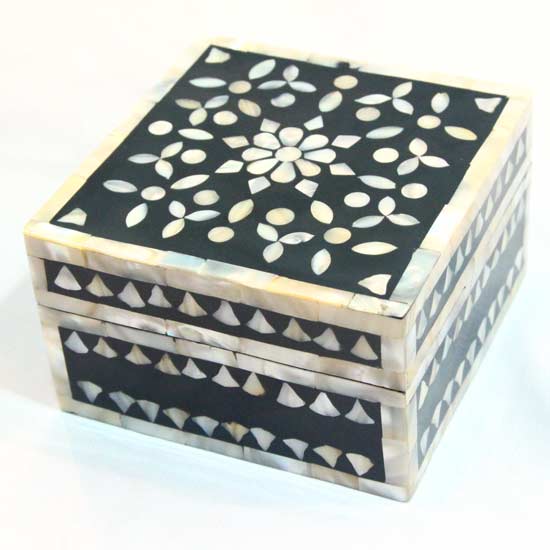 This wooden box features a square shape in black, giving out a sense of mystery. By using shell pieces, floral patterns are formed on the cover of the elegant box. Put your jewelry in this gorgeous box.