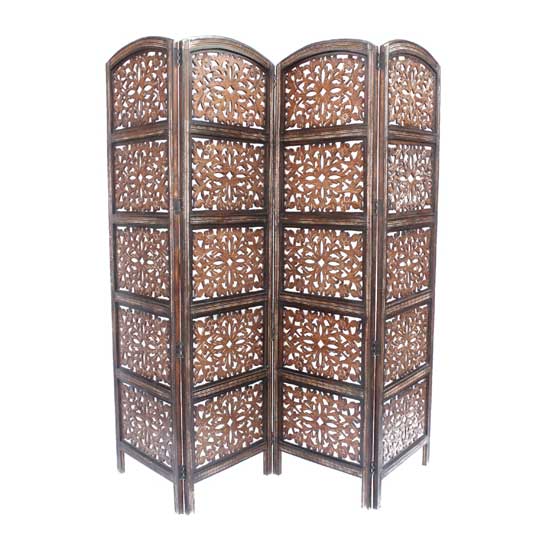 This Chinese-style wooden screen is meticulously carved with sophisticated flower patterns. The four-fold screen can be used as a room divider or as backdrop for dramatic room effects. It will add a touch of refinement to your home decoration.