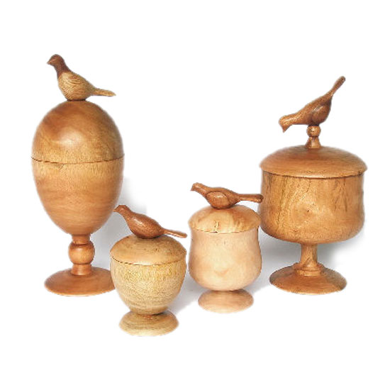 Featured is a series of wooden containers in alternating sizes and shapes. Those wooden containers are innovatively designed with a bird image on top. Those containers are surely safe and convenient for household use.
